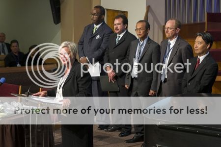 Photo 2: Sandra Roberts speaks to delegates after being elected president of the Southeastern California Conference of Seventh-day Adventists. Behind her are the other elected administrators (l-r): George King, VP Black Ministries; Alberto Ingleton, VP Hispanic Ministries; Elizer Sacay, VP Asian/Pacific Ministries; Verlon Strauss, treasurer; and Jonathan Park, executive secretary.